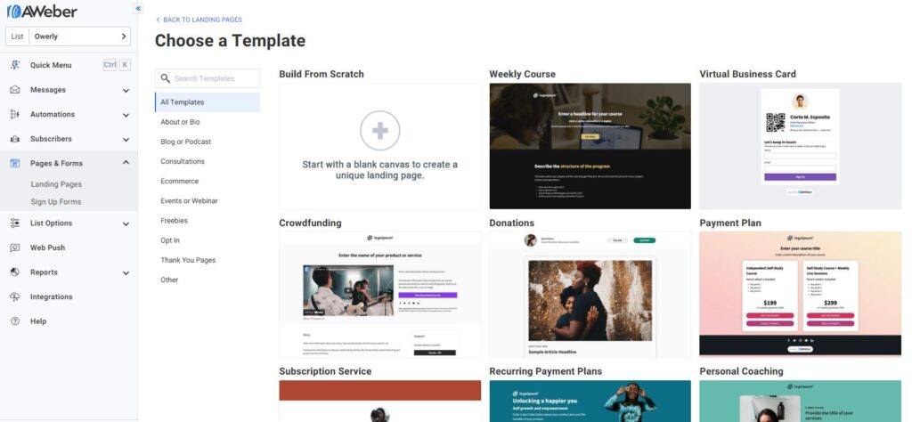 Once you make your Aweber account, simply goto pages and forms in the left hand menu, click "Landing Pages" and you will see a bevy of aesthetically pleasing landing pages to help you capture leads directly into your Aweber email list at no extra cost! Something that used to cost upwards of $500 a year on Leadpages or Clickfunnels is now free to Aweber email marketing users. As your list builds, you will be able to email your list with updates and offers.
